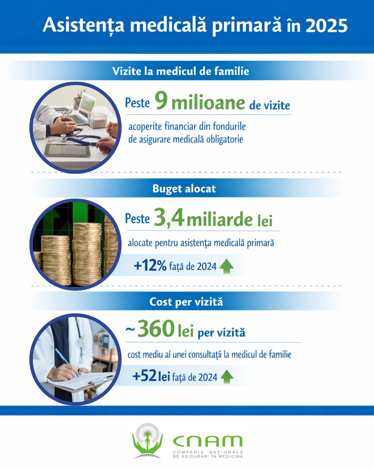 Peste nouă milioane de vizite la medicul de familie au fost acoperite financiar în anul 2025 din fondurile de asigurare obligatorie de asistență medicală. Costul mediu al unei vizite a fost de circa 360 de lei, în creștere cu 52 de lei comparativ cu anul 2024.