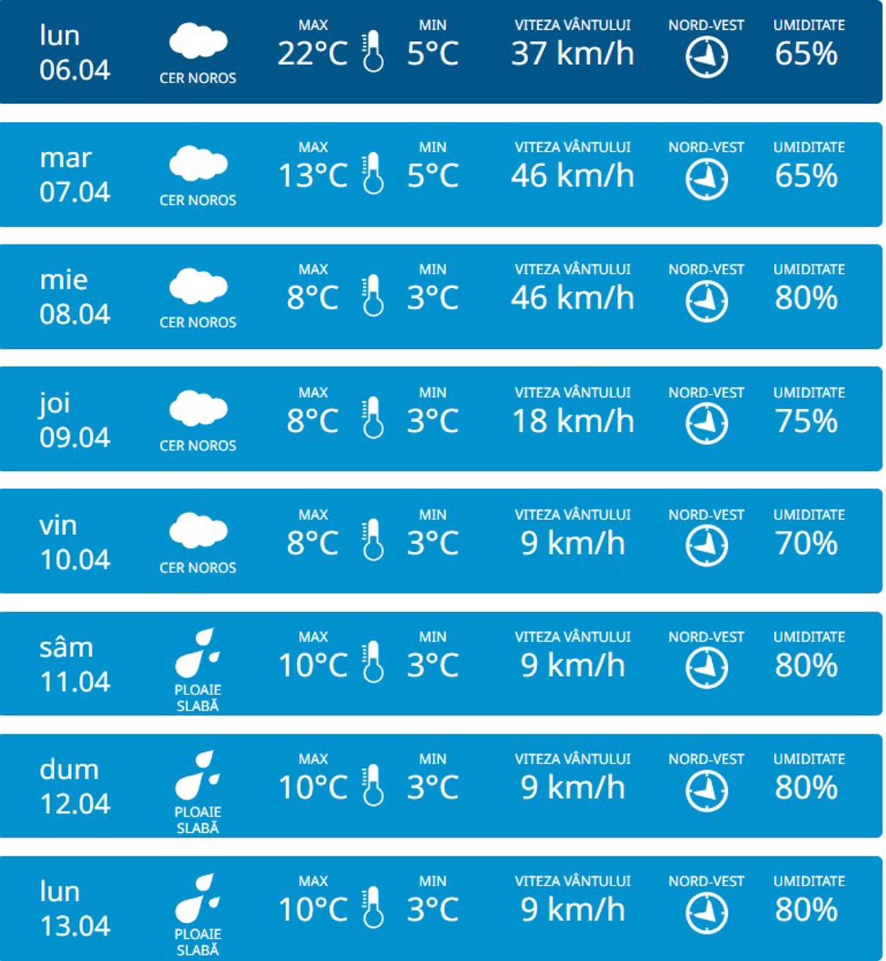 Potrivit meteorologilor, pe 7 aprilie, temperatura aerului va fi de 13 grade pe timp de zi, iar noaptea va coborî până la 5 grade Celsius.