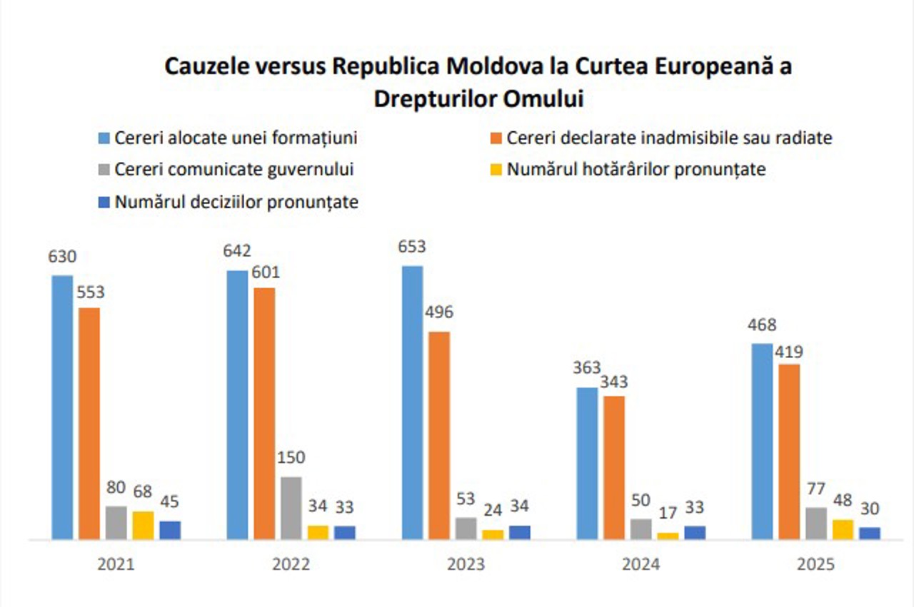 Curtea Europeană a Drepturilor Omului (CtEDO) a pronunțat, anul trecut, 48 de hotărâri în privința Republicii Moldova, în care a fost constatată cel puțin o încălcare a prevederilor Convenției. Cele mai frecvente încălcări vizează nerespectarea dreptului la un proces echitabil și neasigurarea protecției proprietății. Prin alte 30 de decizii, instanța de la Strasbourg a radiat de pe rol sau a declarat inadmisibile cererile împotriva Republicii Moldova.