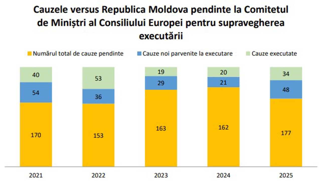 Ministrul Justiției, Vladislav Cojuhari, a subliniat în ședința Executivului că agentul guvernamental a prezentat, în anul 2025, către Comitetul de Miniștri al Consiliului Europei (organul responsabil de monitorizarea executării hotărârilor Curții Europene) 42 de planuri de acțiune, rapoarte și comunicări, fapt care a permis încetarea supravegherii a 34 de cauze prin adoptarea de rezoluții finale.