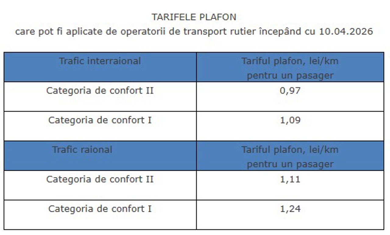 Biletele la călătoriile în traficul interraional pot fi calculate având la bază un tarif plafon de 97 bani/km și, respectiv, 1.9 lei/km pentru transportul care oferă confort suplimentar. Majorarea față de cea din martie este de 7 bani.