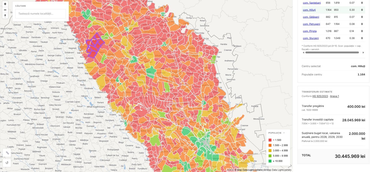 Simulatorul este ușor de utilizat: selectezi localitățile dorite, iar sistemul arată dacă această combinație este posibilă și ce beneficii ar putea genera amalgamarea. Instrumentul verifică dacă sunt respectate criteriile legale, indică un posibil centru administrativ și estimează resursele financiare de care ar putea beneficia noua primărie.