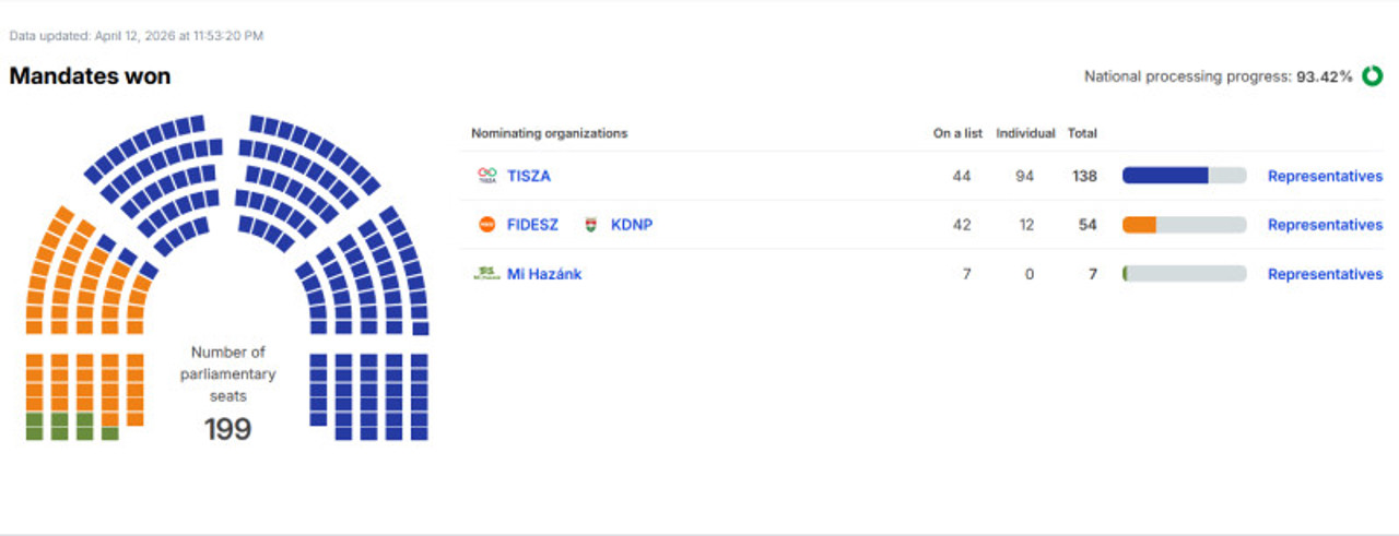 Partidul Tisza, condus de Peter Magyar, deține 138 de mandate parlamentare din cele 199, după numărarea a 93.42% din voturi, dintre care 94 câștigate prin vot uninominal și 44 prin vot pe liste.