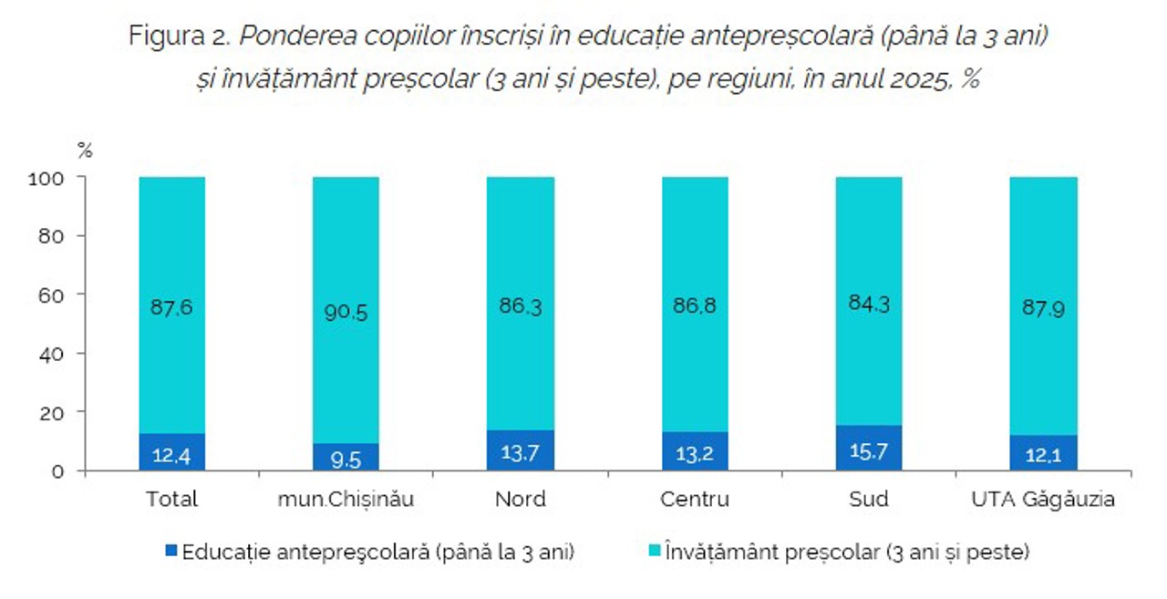 Potrivit datelor Biroului Național de Statistică, din totalul copiilor în instituțiile de educație timpurie, peste jumătate - 52.4% - au fost înscriși în instituțiile din mediul urban. Sub aspect de gen, majoritatea copiilor sau 51.7 % erau băieți.