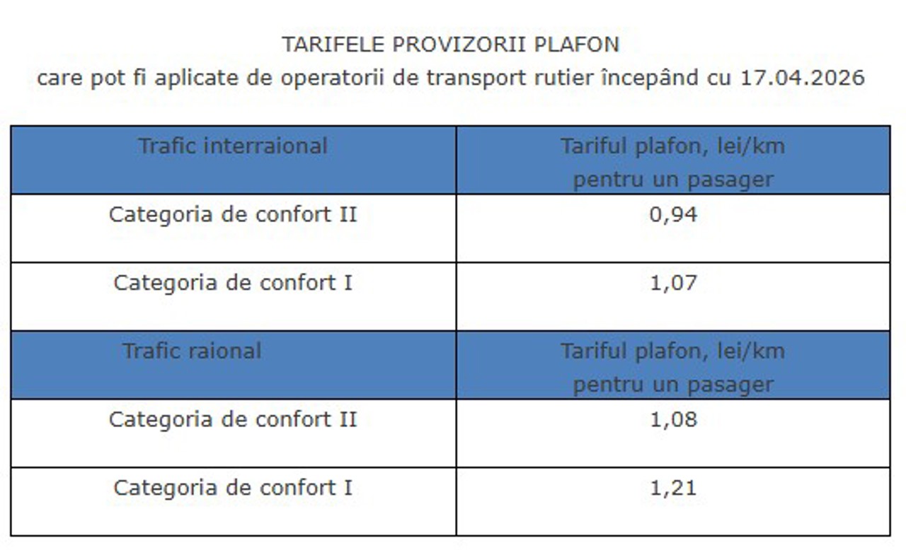 Agenția Națională Transport Auto (ANTA) a plafonat tarifele la 1.08 lei/km și 1.21 lei/km pentru serviciile regulate în traficul raional, în funcție de clasa de confort, și 0.94 lei/km, respectiv, 1.07 lei/km pentru transportul interraional.