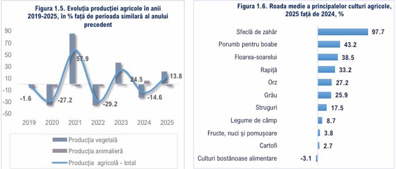 Agricultura a avut o evoluție remarcabilă în 2025, cu o creștere de 13.8% față de anul anterior, atingând circa 46.7 miliarde de lei. Această creștere se datorează majorării cu 21.3% a producției vegetale, ca urmare a condițiilor climatice favorabile. Totodată, raportul subliniază caracterul instabil al sectorului, permanent expus riscurilor meteorologice.