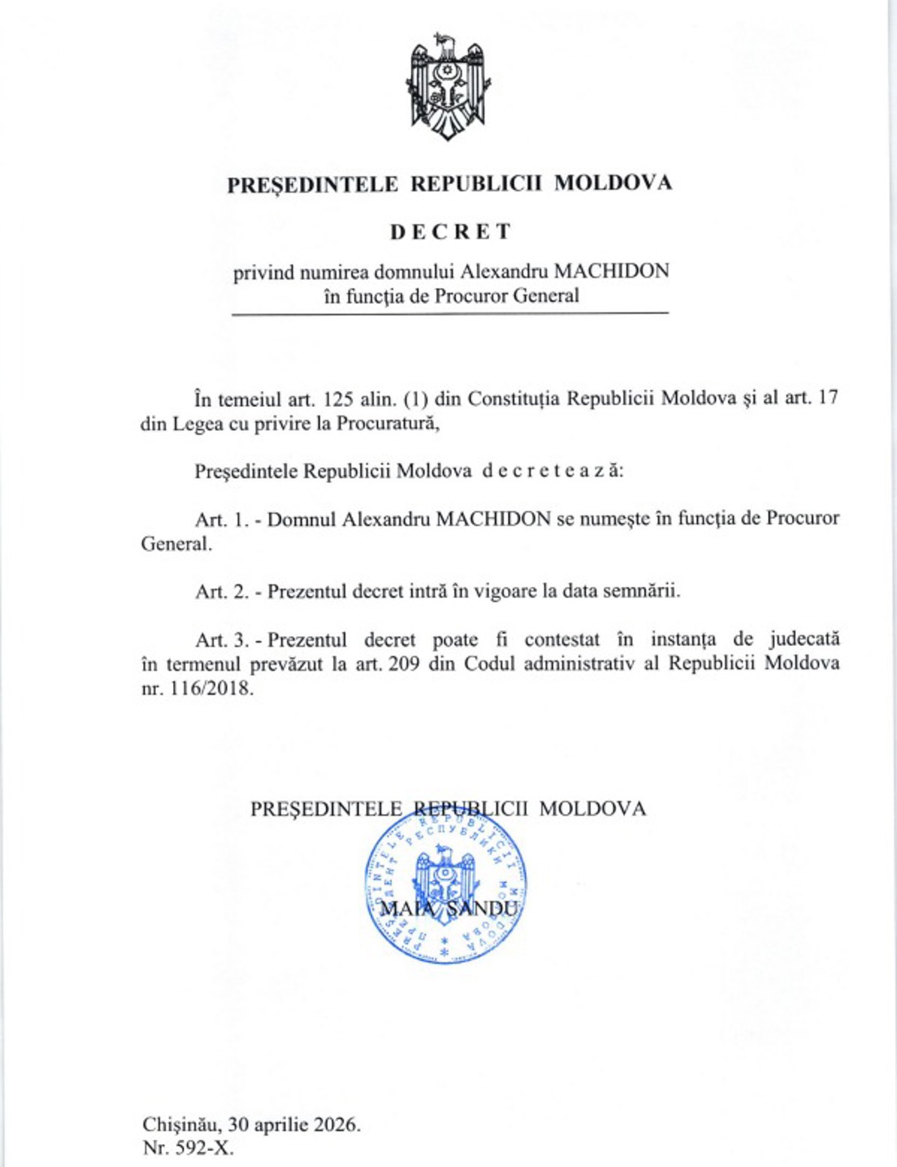 Президент Майя Санду подписала указ о назначении Александру Макидона на пост генпрокурора. До этого он почти год исполнял обязанности главы учреждения — с 28 мая 2025 года.