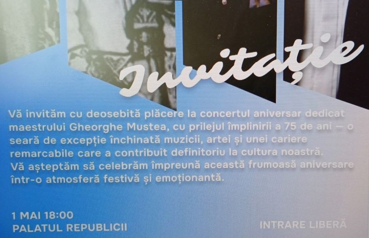 Orchestra Națională Simfonică a Companiei „Teleradio-Moldova” invită iubitorii de muzică la spectacolul aniversar al compozitorului și dirijorului Gheorghe Mustea. Evenimentul, organizat cu prilejul celei de-a 75-a aniversări a maestrului, va avea loc vineri, 1 mai, la Palatul Republicii din Chișinău, cu începere de la ora 18:00.