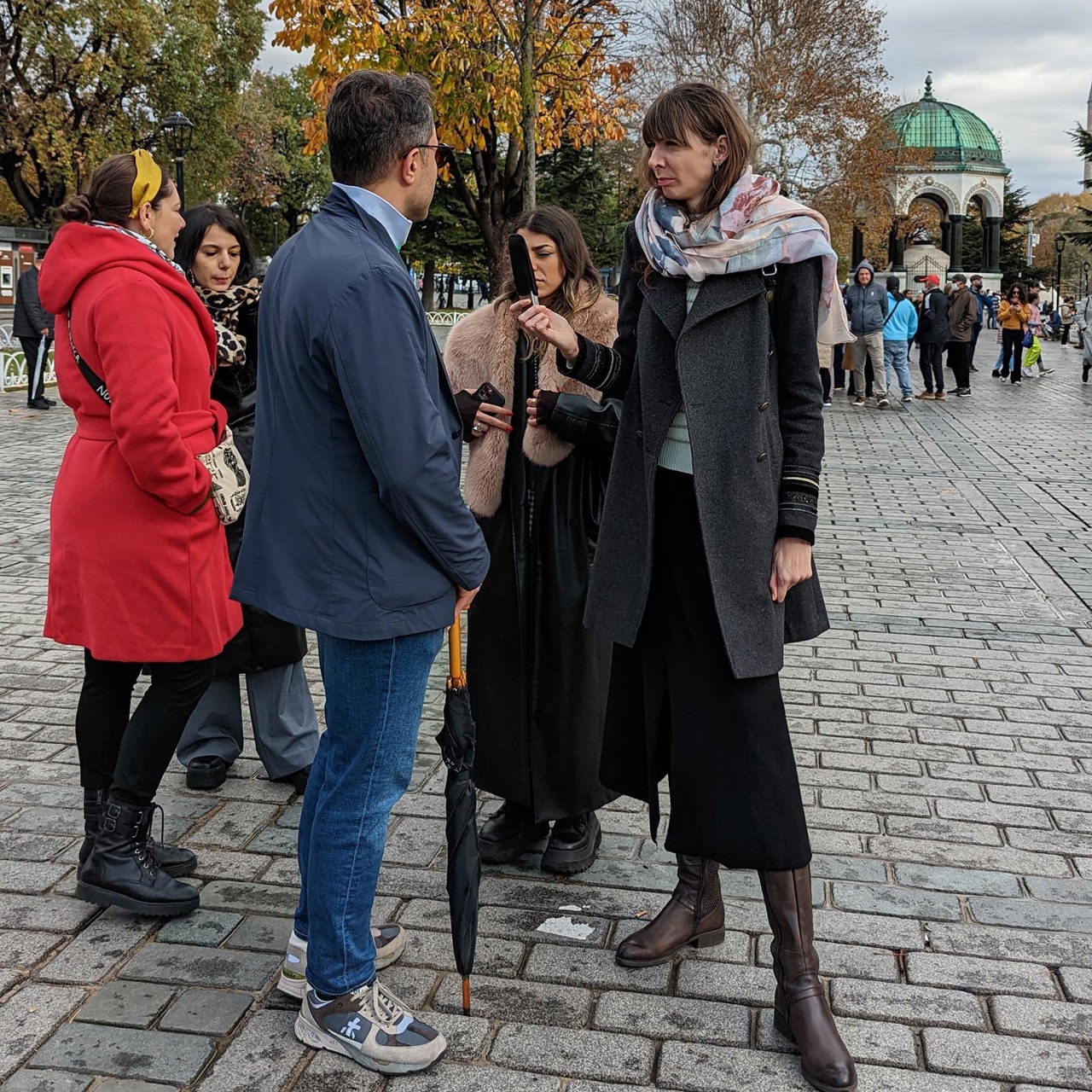 Politicos s-a interesesat dacă sunt pentru prima data în „Marele Bazar”. „Este un bazar foarte vechi, cel mai mare și cel mai vechi, cred, din lume, noi așa zicem. În fiecare zi vin circa 500 mii de oameni aici. Totul este bine. Deci, petreceți timpul frumos”, a sugerat Emleha.