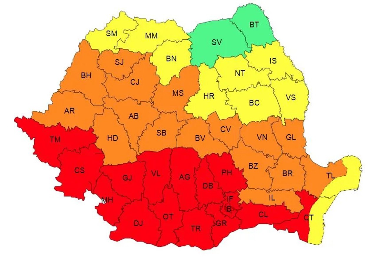 Administrația Națională de Meteorologie (ANM) a României a emis vineri, 25 iulie, noi alerte de caniculă, valabile în acest weekend. Unele zone ale țării vor fi, de sâmbătă, sub Cod roșu de caniculă, caracterizat printr-un val de căldură persistent și intens, disconfort termic deosebit de accentuat și noapte tropicală. De asemenea, meteorologii au emis și un Cod galben de furtuni în zone din 19 județe.