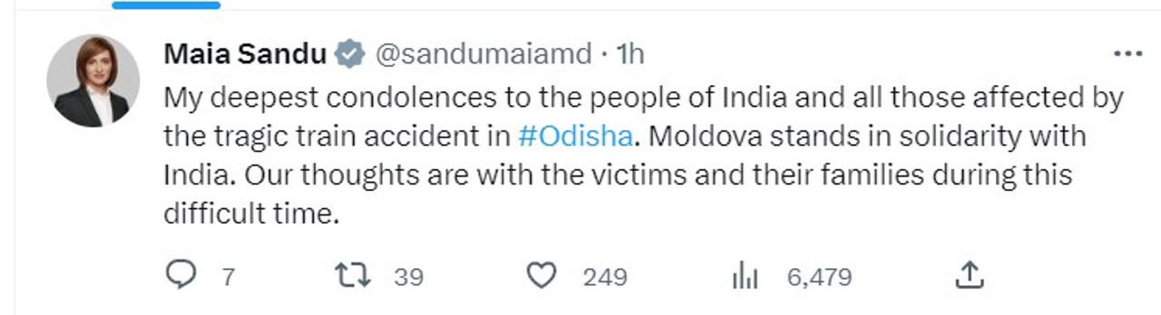 Președinta țării, Maia Sandu, a transmis condoleanțe oamenilor din India și tuturor celor afectați de tragicul accident de tren din Odisha. „Moldova este solidară cu India. Gândurile noastre sunt la victime și la familiile lor în această perioadă dificilă”, a scris șefa statului pe contul său de Twitter.