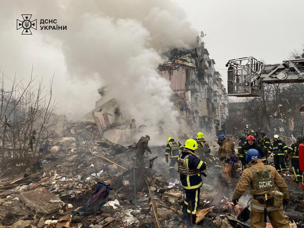 The attack left two people dead and seven others injured, according to the State Emergency Service. The building’s entrance was destroyed from the first to the fifth floor, and the explosion triggered a fire. Nearby buildings and a dozen vehicles sustained damage.