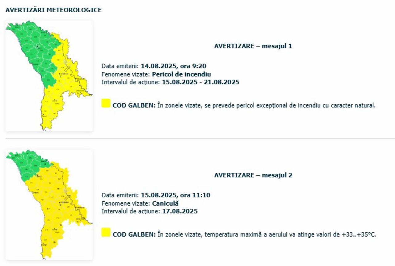 According to the State Hydrometeorological Service, tomorrow’s highs will be between 33 and 35 degrees Celsius across most of Moldova. Additionally, a yellow code for fire danger will be in effect until August 21 for the southern, central, and western regions.