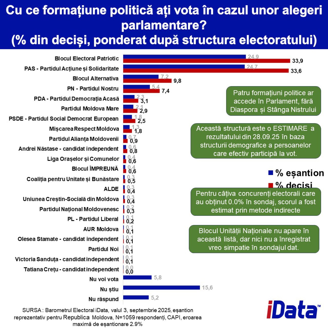 Pentru Blocul Electoral „Patriotic”, constituit din Partidul Socialiștilor, Partidul Comuniștilor, Partidul Inima Moldovei și Partidul Viitorul Moldovei, ar vota 24.9% din alegători.