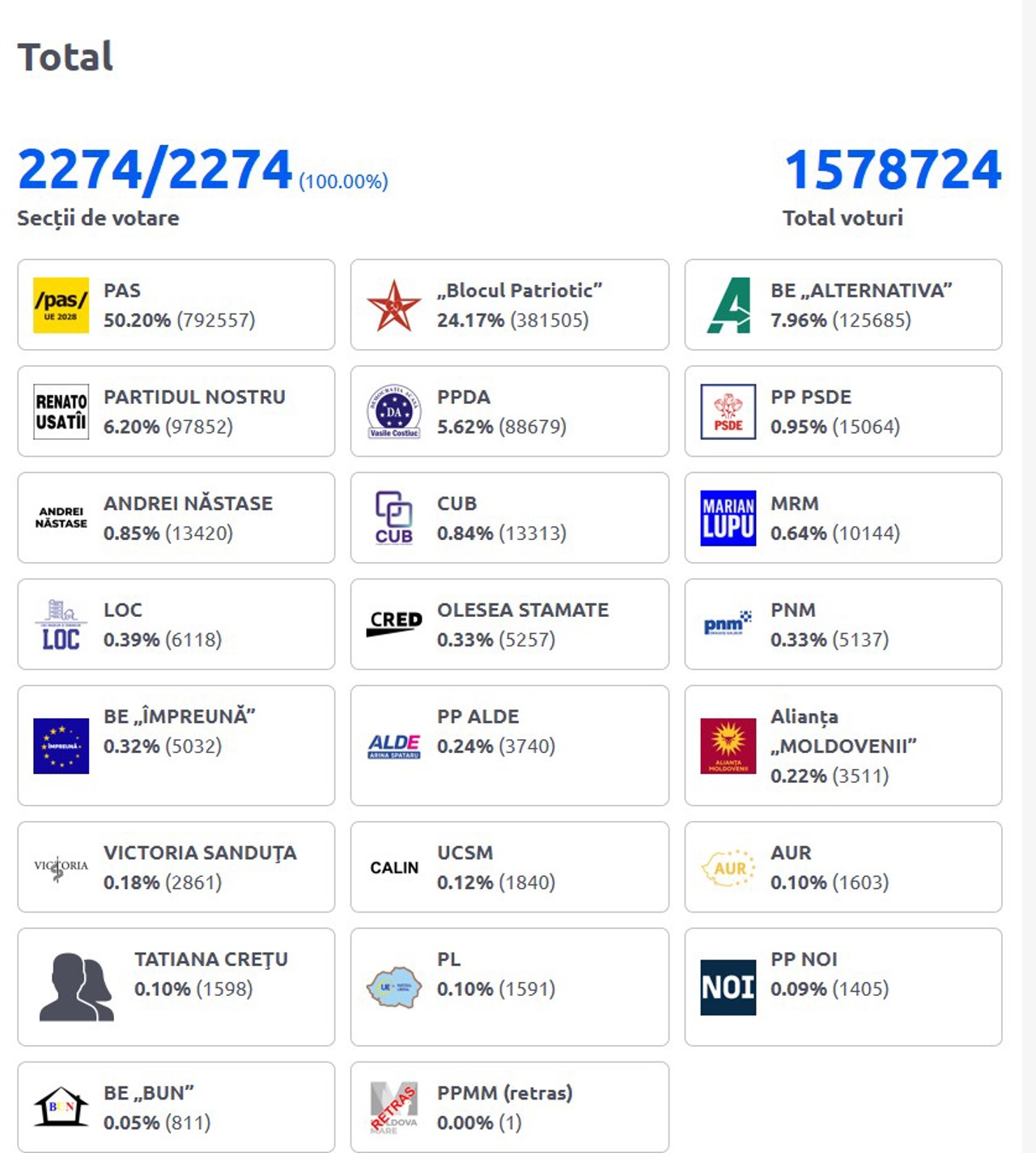 Partidul Acțiune și Solidaritate (PAS) a acumulat 50.03% din voturi la alegerile parlamentare din 28 septembrie, potrivit rezultatelor preliminare prezentate de Comisia Electorală Centrală după centralizarea datelor din 99.52% de procese-verbale.