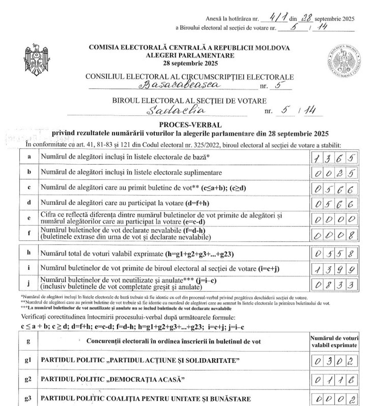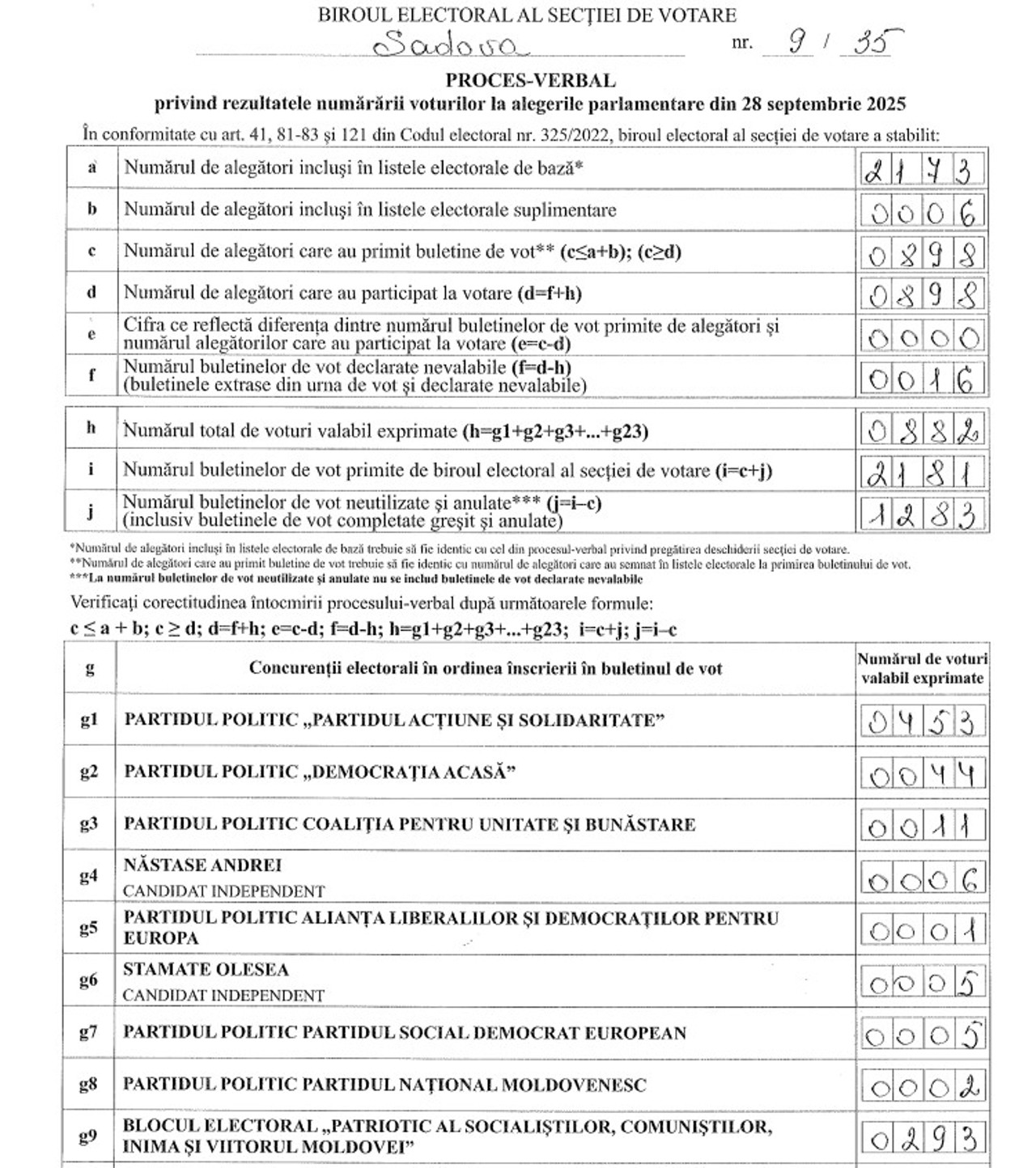 Thus, according to data from the vote counting minutes, over 51.3% of the residents of Sadova, Călărași district, who went to the polls opted for PAS – 453 out of the 882 votes.