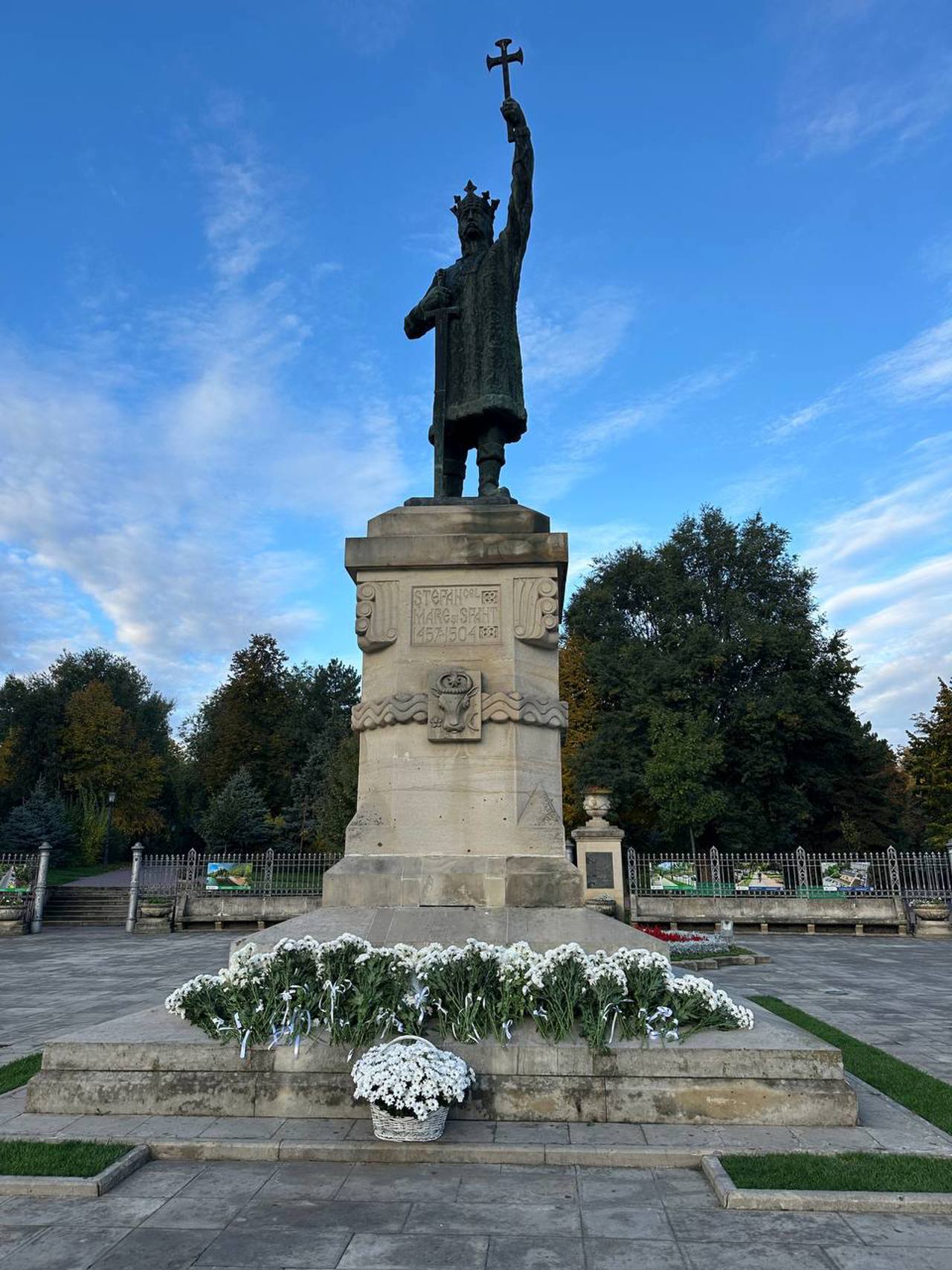La baza monumentului au fost depuse aranjamente florale albe, ca semn de respect și recunoștință față de marele domnitor. Lumina blândă a dimineții a completat cadrul calm al momentului comemorativ.