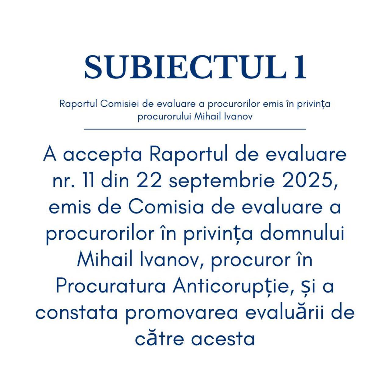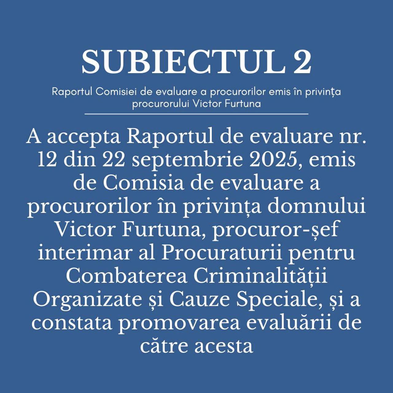 The Superior Council of Prosecutors (SCP) approved on Tuesday, October 21, the reports of the Prosecutors Evaluation Commission, according to which Furtuna and Ivanov passed the vetting.