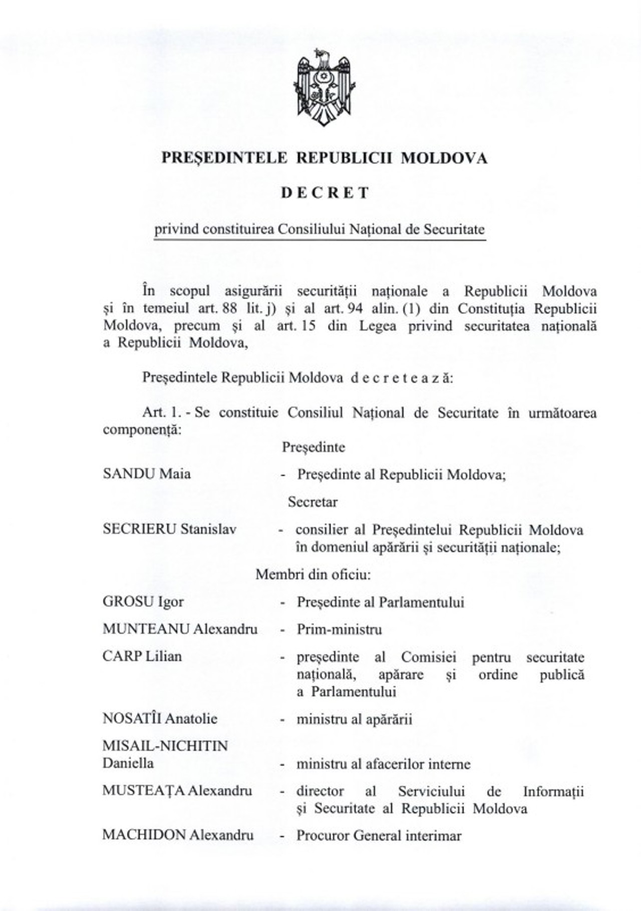 Șefa statului, Maia Sandu, a decretat instituirea noului Consiliu Național de Securitate – organul consultativ care acordă președintelui Republicii Moldova consultații în problemele de securitate națională și îi prezintă recomandări în probleme de politică externă și internă.