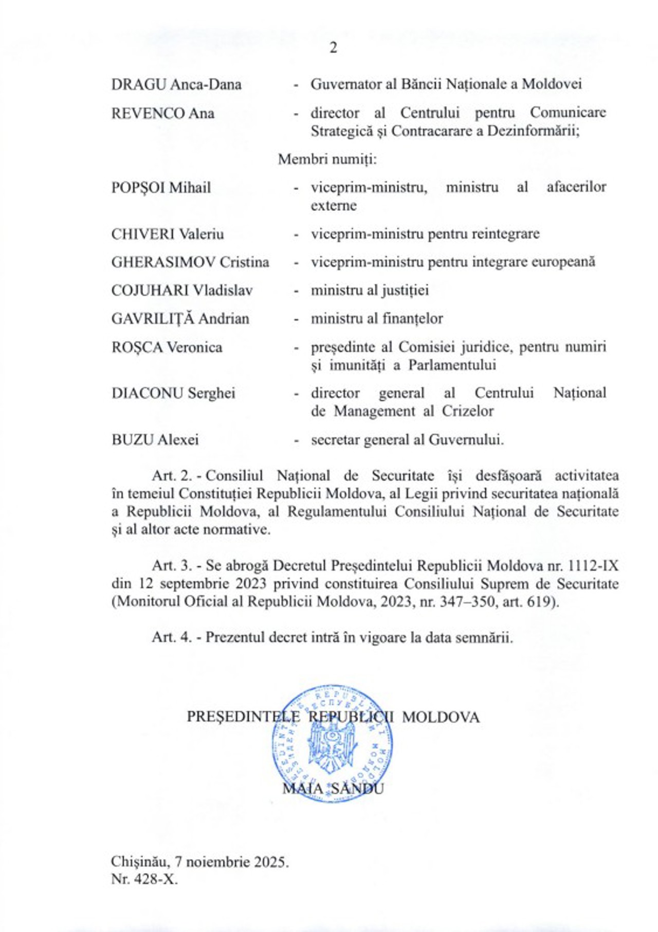 Din Consiliu fac parte, de asemenea, șeful Serviciului de Informații și Securitate, Alexandru Musteața, procurorul general interimar, Alexandru Machidon, guvernatoarea Băncii Naționale a Moldovei, Anca Dragu, și directoarea Centrului pentru Comunicare Strategică și Contracararea Dezinformării, Ana Revenco.