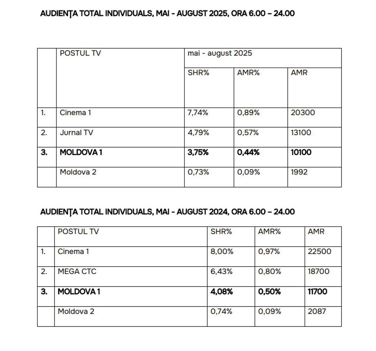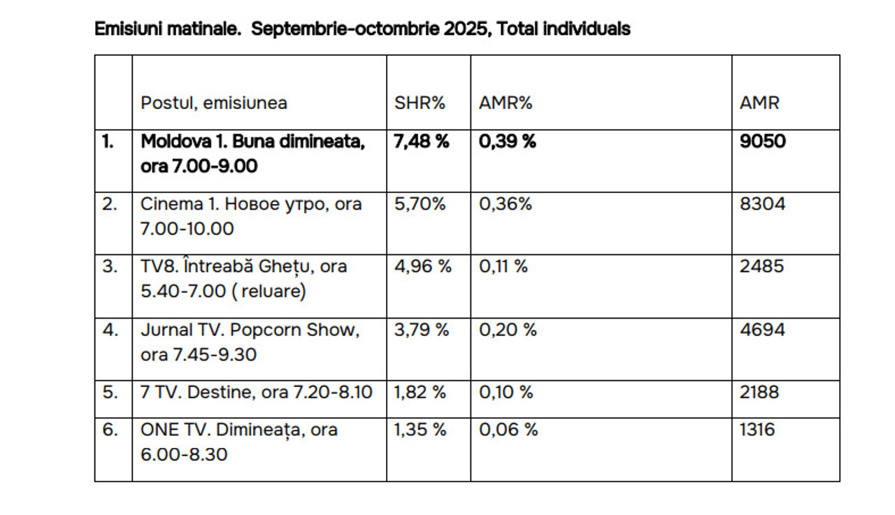 According to measurements conducted from January to October 2025, Moldova 1 TV ranked third among television stations in the Republic of Moldova, following Cinema 1 and Jurnal TV, with an average market share (SHR) of 3.79%. In the same period in 2024, Moldova 1 TV ranked seventh.