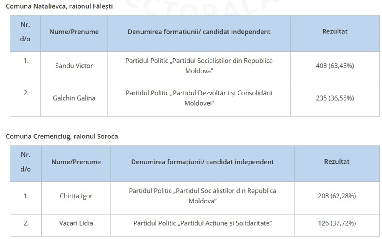 Preliminary data from the Central Electoral Commission indicates that PSRM representatives achieved a significant victory in the first round in the Natalievca commune of Fălești district and the Cremenciug commune of Soroca district.