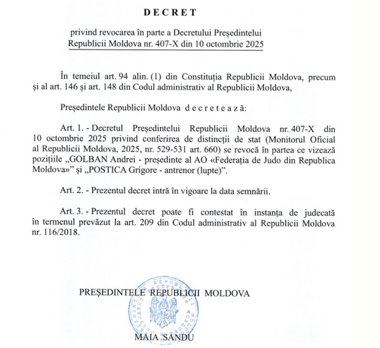 Президент Майя Санду своим указом отменила решение о присуждении государственных наград главе Общественного объединения «Федерация дзюдо Республики Молдова» Андрею Голбану и тренеру по борьбе Григорию Постикэ. Документ был подписан 5 декабря.