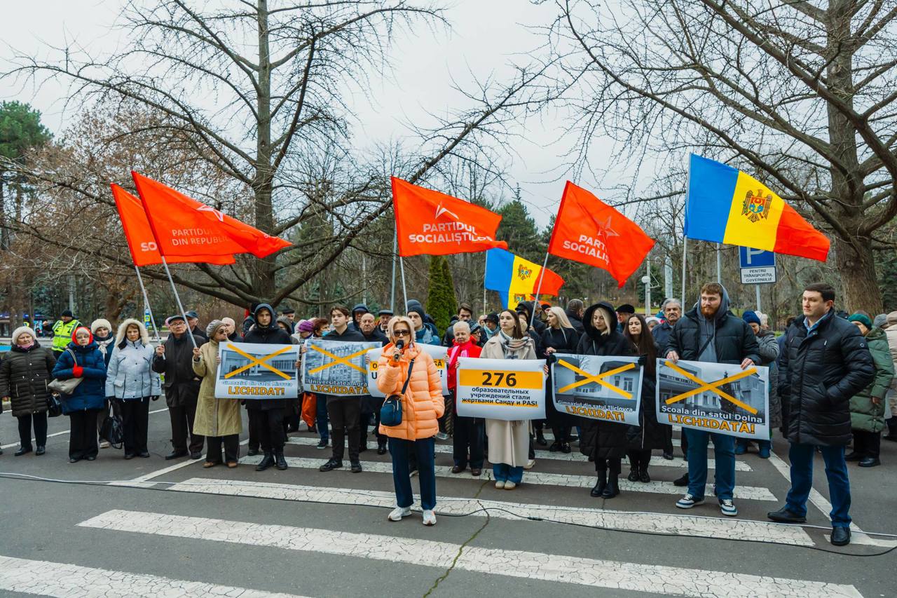 Deputații Partidului Socialiștilor din Republica Moldova (PSRM) și-au condus marți, 9 decembrie, simpatizanții la un protest organizat în fața Guvernului împotriva reformei inițiate de Ministerul Educației și Cercetării (MEC). Manifestanții au acuzat autoritățile de închiderea școlilor și au cerut demisia actualei guvernări. În replică, responsabilii de la MEC susțin că ministerul pune accentul pe calitate, nu pe reducerea cheltuielilor, iar resursele eliberate vor fi reinvestite integral în educație.