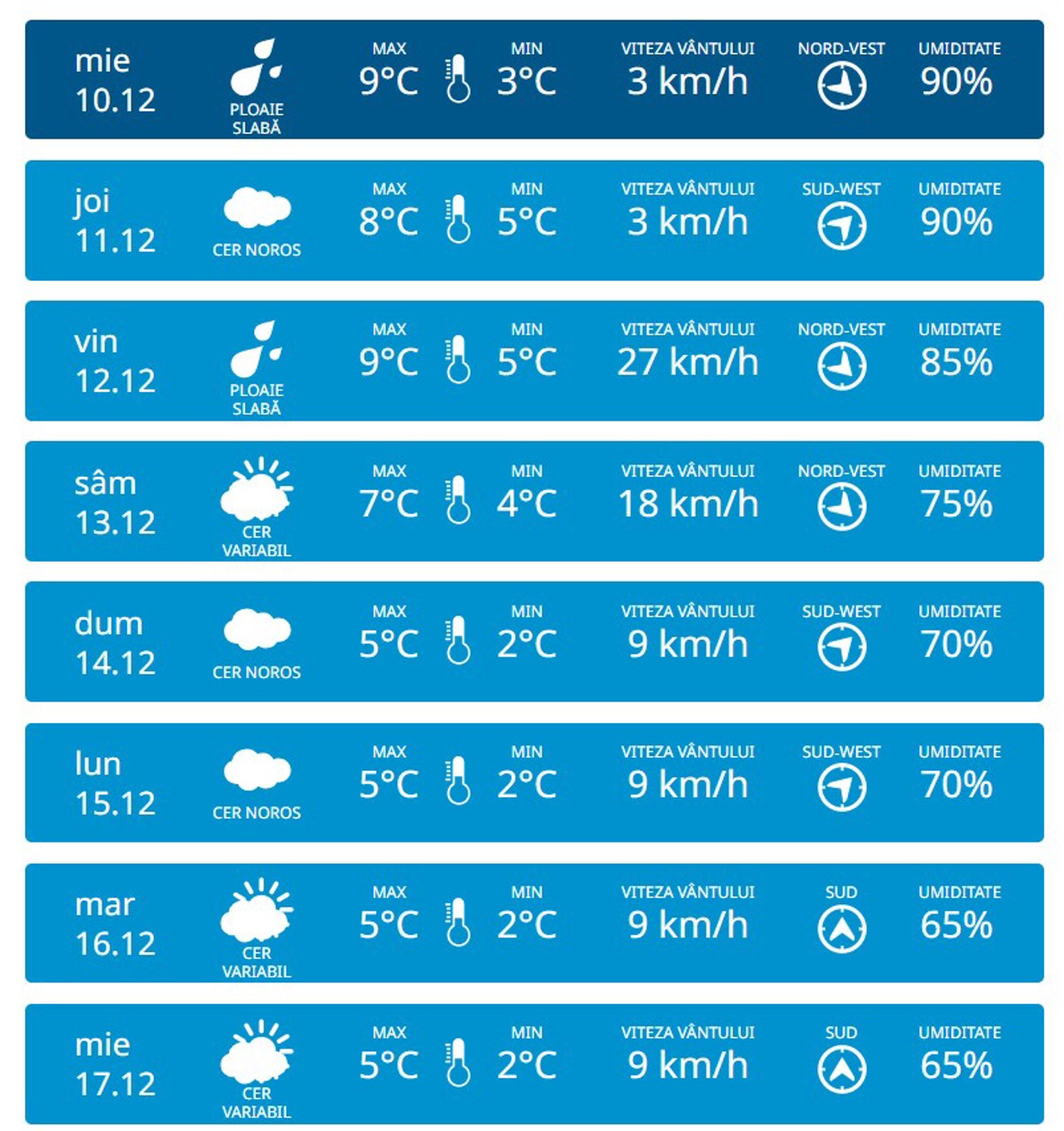 Duminică, 14 decembrie, termometrele vor indica cel mult 5 grade ziua și 2 grade noaptea.