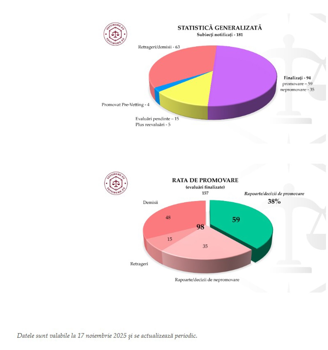 Menționăm că, de la lansarea activității sale în 2023, Comisia de Evaluare a Judecătorilor a demarat vetting-ul în privința a 185 de subiecți, dintre care 64 au demisionat sau s-au retras, iar alți patru au promovat anterior evaluarea de tip pre-vetting.