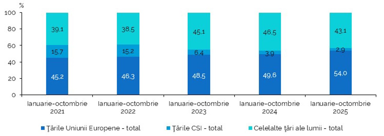 Exporturile de mărfuri destinate țărilor Uniunii Europene au totalizat, în perioada menționată, 2.06 miliarde de dolari SUA, fiind în creștere cu 4.4% și deținând o pondere de 68.2% în totalul exporturilor, cu 1.1 puncte procentuale mai mult față de ianuarie–octombrie 2024.