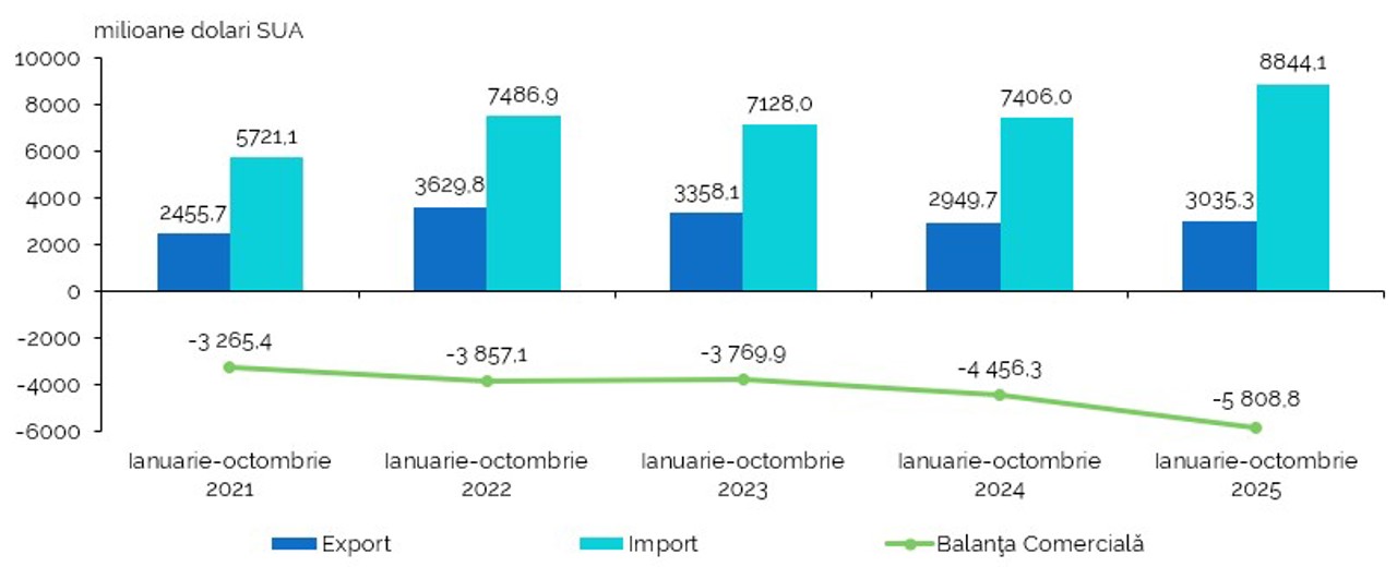 Decalajul dintre ceea ce vinde și ceea ce cumpără Republica Moldova de peste hotare a determinat acumularea, în perioada ianuarie–octombrie 2025, a unui deficit al balanței comerciale de 5.8 miliarde de dolari, cu 30.3% mai mare comparativ cu aceeași perioadă a anului trecut.