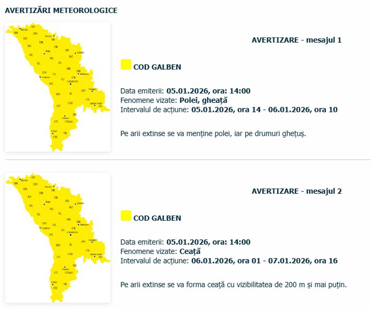 Primul dintre cele două Coduri galbene emise de meteorologi - cel de polei și ghețuș - a intrat luni, 5 ianuarie, în vigoare și va fi valabil pe tot teritoriul R. Moldova până marți, 6 ianuarie, la ora 10:00.