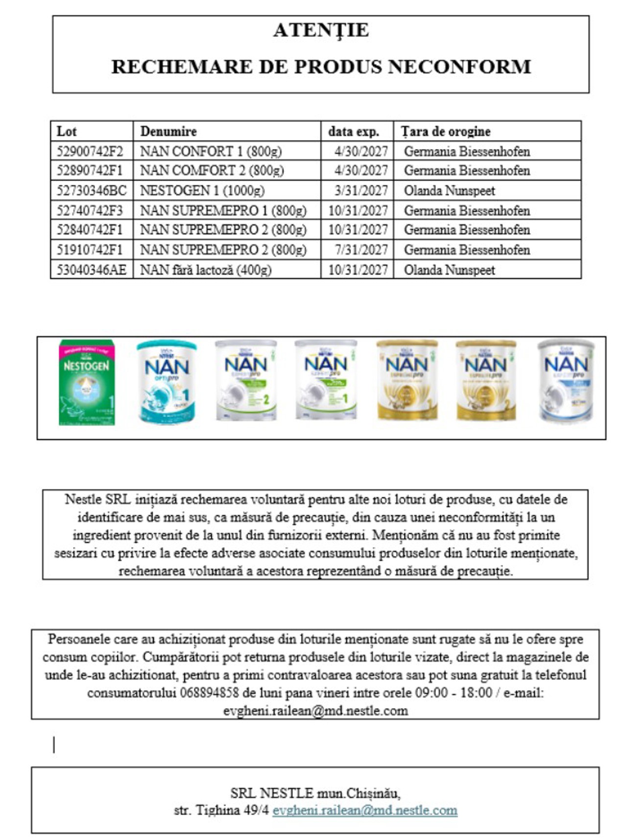 Agenția Națională pentru Siguranța Alimentelor (ANSA) anunță retragerea din comerț a unor noi loturi de lapte praf pentru bebeluși, marca Nestle, din cauza unei neconformități la un ingredient provenit de la furnizorii externi.