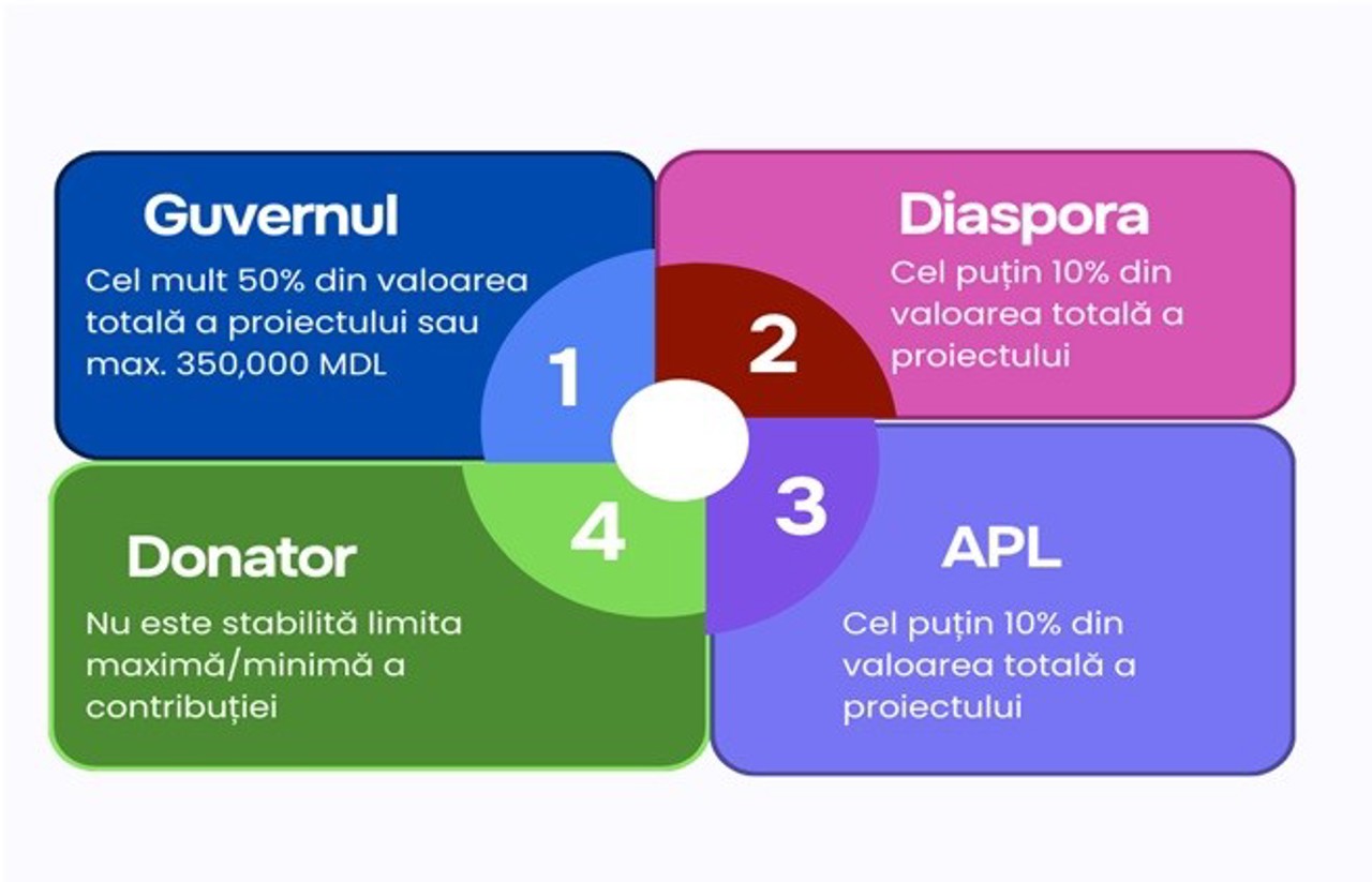 Pentru a beneficia de grantul oferit de Guvern, autoritatea publică locală și diaspora trebuie să asigure fiecare o contribuție de cel puțin 10% din valoarea totală a bugetului proiectului și, totodată, să identifice o a patra sursă de cofinanțare. Contribuția partenerilor de dezvoltare nu este limitată.