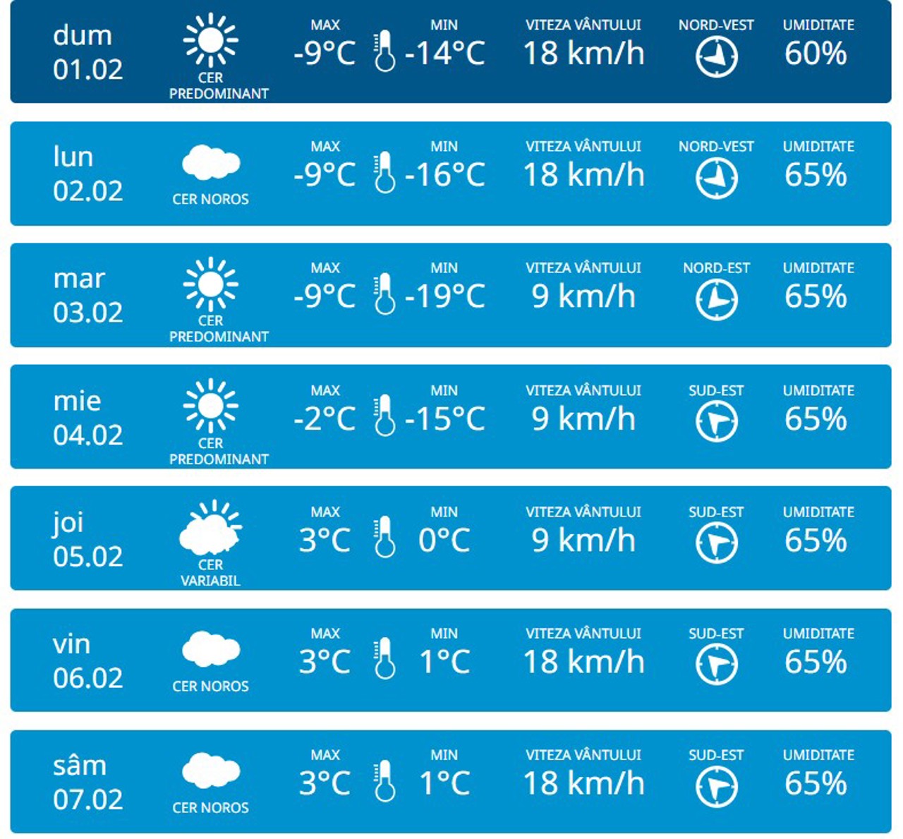 Temperatura minimă a aerului va atinge noaptea valori de minus 20 de grade Celsius.