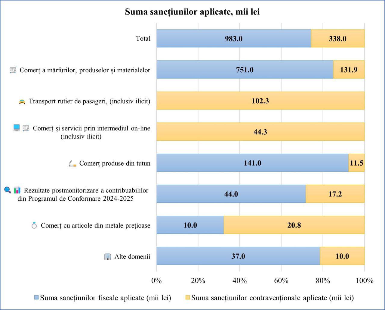 Sancțiunile aplicate au însumat 983 de mii de lei sub formă de sancțiuni fiscale și alte 338 de mii de lei sub formă de sancțiuni contravenționale.