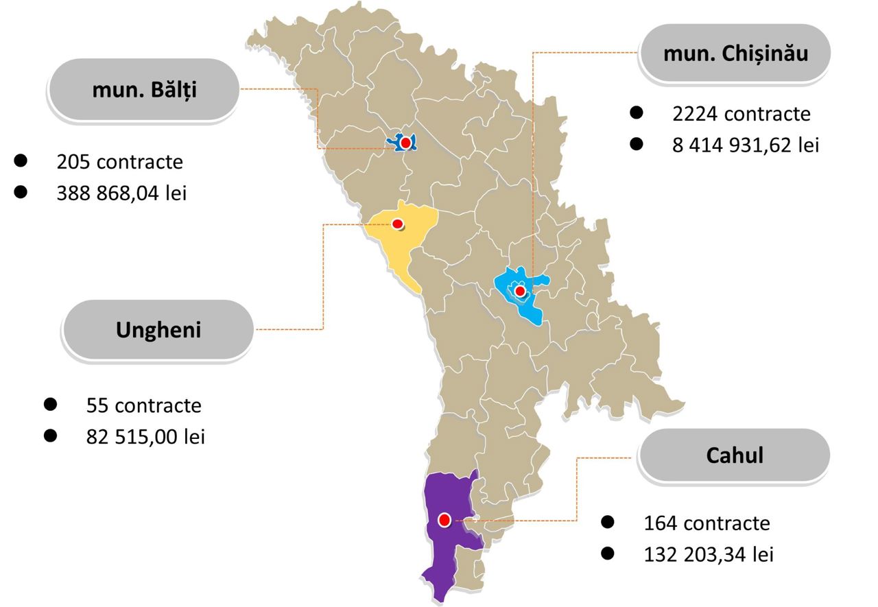 Potrivit datelor prezentate de SFS cele mai multe contracte de dare în locațiune au fost înregistrate în municipiul Chișinău - 2.224 de contracte, care au generat încasări de peste 8.4 milioane de lei. În municipiul Bălți au fost înregistrate 205 contracte, cu încasări de 388.868 de lei, iar în Cahul - 164 de contracte, în valoare totală de 132.203 lei. În Ungheni au fost raportate 55 de contracte, care au adus la buget 82.515 lei.
