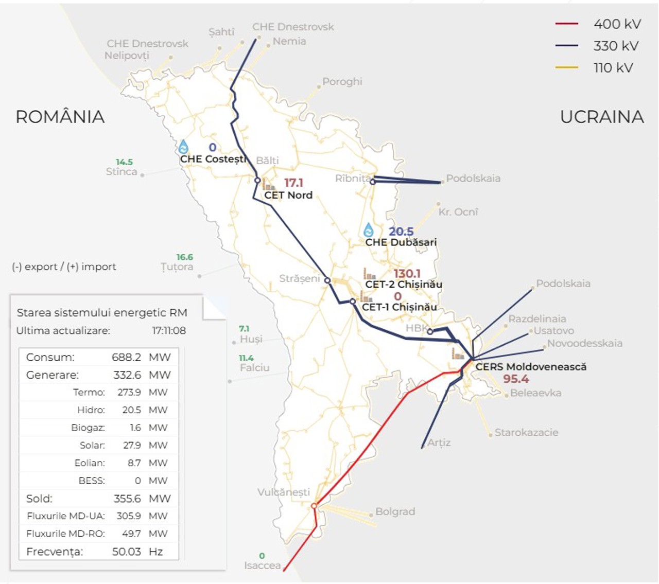 Liniile de 110 kV au o capacitate redusă și pot alimenta doar anumite zone din vestul țării. Ele nu pot susține consumul la nivel național. De asemenea, linia de la Dnestrovsk, de 330 kV, are o capacitate mai mică decât cea de 400 kV și nu poate acoperi întregul deficit. În plus, posibilitățile de import din Ucraina sunt limitate nu doar tehnic, ci și din cauza situației din teren: sistemul energetic ucrainean este grav afectat de atacurile repetate, iar statul vecin se confruntă el însuși cu un deficit de energie, ceea ce reduce semnificativ capacitatea de a exporta curent către Republica Moldova.