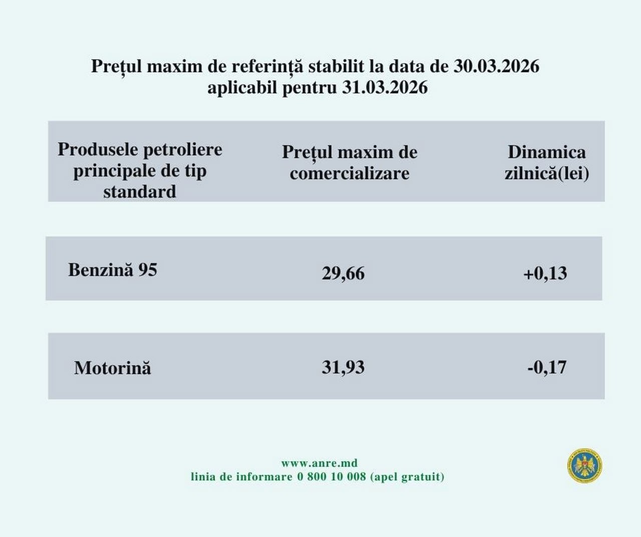 Potrivit prețurilor-plafon stabilite de Agenția Națională pentru Reglementare în Energetică (ANRE) pentru ziua de 31 martie, un litru de motorină va costa 31.93 de lei, în scădere cu 17 bani față de weekendul trecut.
