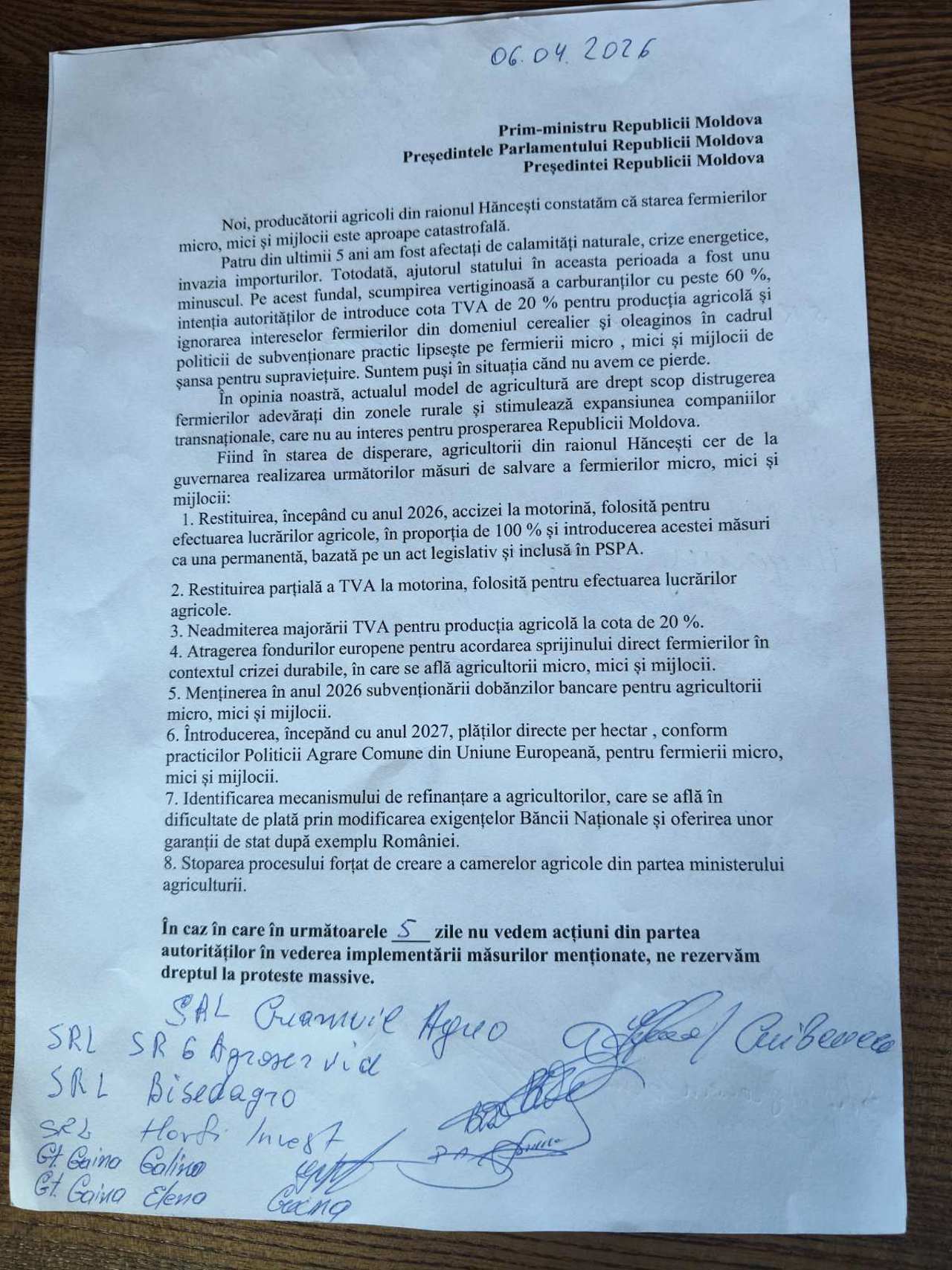 Vadim Ciobanu, president of the "Forța Fermierilor" Association, stated, “If there is no response from the government within five days, we will start preparing for more significant protests. It's not just the farmers from Hancesti; they serve as a benchmark for farmers across the republic. We have also held meetings in Leova, Cahul, and Fălești. We intend to conduct a peaceful protest; we are not violent, yet we are sometimes treated as the enemies of the people.”