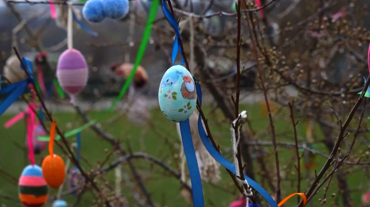 Locuitorii evacuați din Bahmut, ocupat acum de forțele rusești, conform tradiției, s-au adunat în jurul pomilor împodobiți de Paște, decorați cu ouă încondeiate.