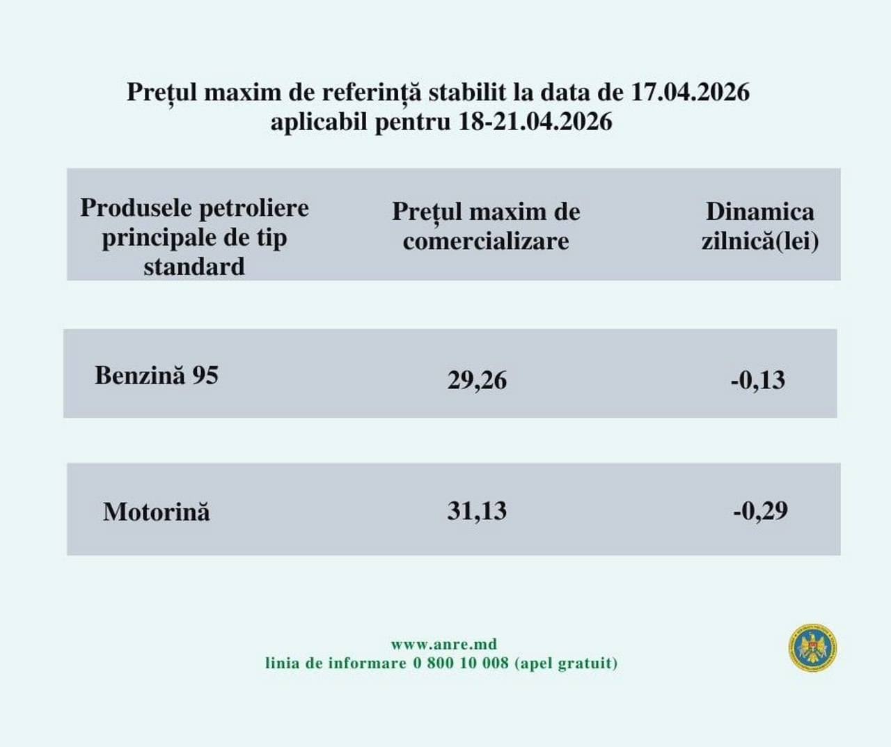 Prețurile carburanților continuă să scadă, potrivit noilor cotații-plafon anunțate de Agenția Națională pentru Reglementare în Energetică (ANRE). În următoarele patru zile, în perioada 18–21 aprilie, prețul unui litru de motorină va fi redus cu încă 29 de bani.