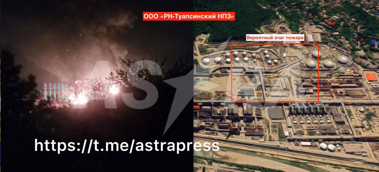 Potrivit analizei Astra asupra imaginilor filmate de martori, în urma atacului arde într-adevăr rafinăria din Tuapse. Potrivit informațiilor preliminare, ar fi fost vizat parcul de rezervoare aflat în apropierea instalației ELOU-AVT-12, consideră un analist OSINT al Astra.
