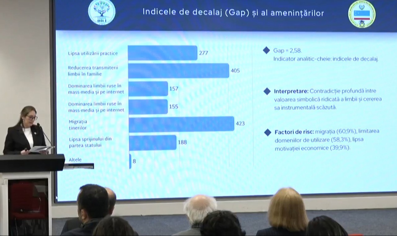 Principalul factor de risc pentru limba găgăuză îl reprezintă migrația tinerilor, indicată de 60.9% dintre respondenți. La acesta se adaugă scăderea transmiterii limbii în familie, influența dominantă a limbii ruse în media și internet, precum și sprijinul insuficient din partea statului, a precizat directoarea Centrului de Cercetări Științifice al Găgăuziei „M.V. Marunevici”, Irina Constantinov.