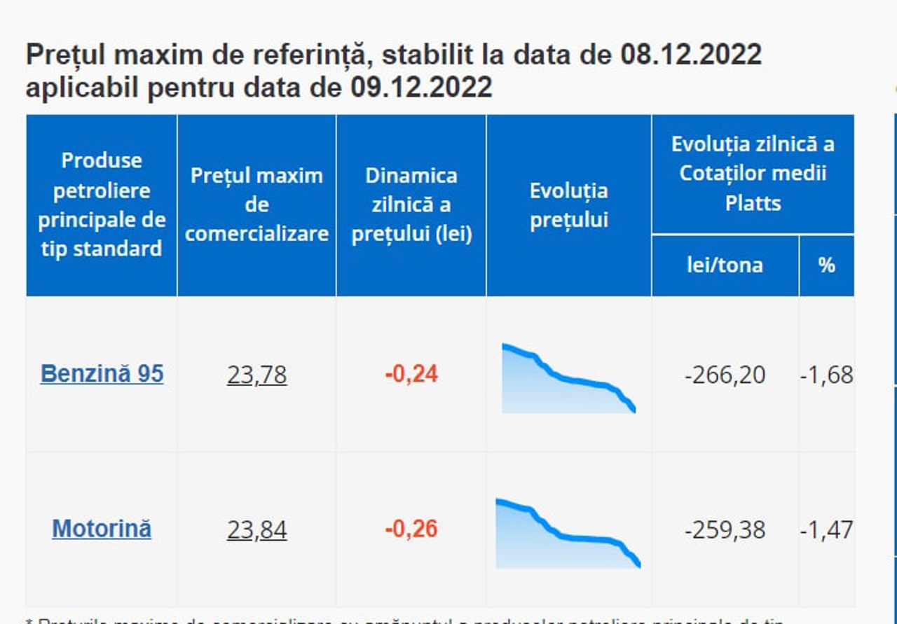 Astfel, un litru de benzină va costa 23,78 lei, cu 24 de bani mai puțin, iar un litru de motorină va costa 23,84 lei, cu 26 de bani mai puțin decât astăzi.